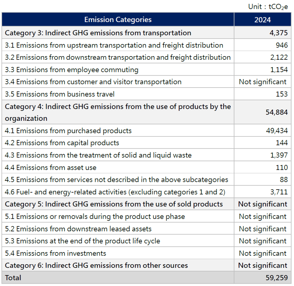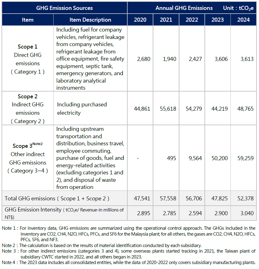 The subsidiary CWTC's Taiwan plant first implemented external verification of ISO 14064-1:2018 greenhouse gas inventory in 2022; the rest of the group initiated external verification of ISO 14064-1:2018 in 2023. For Taiwan, greenhouse gas emissions are calculated using the “Greenhouse Gas Emission Factors Management Table Version 6.0.4” announced by the Taiwan Environmental Protection Administration, the power emission factors published by the Energy Bureau of the Ministry of Economic Affairs, and the Environmental Protection Administration's “Product Carbon Footprint Calculation Platform.” For China, emissions calculations refer to the “2006 IPCC National Greenhouse Gas Inventory Guidelines,” the “China Product Life Cycle Greenhouse Gas Emission Factor Database,” the “2022 National Power Carbon Emission Factor” published by China's Ministry of Ecology and Environment, the Ecoinvent database, and the UK Department for Environment, Food and Rural Affairs (Defra) “Greenhouse Gas Reporting: Conversion Factors 2024” (hereafter “Defra 2024”). For Malaysia, emissions are calculated using “Defra 2024” and the grid emission factors published by the Malaysian Energy Commission. For Singapore, emissions are calculated using the grid emission factors published by the Singapore Energy Market Authority. The global warming potential (GWP) factors used are based on the IPCC Assessment Reports AR5 and AR6. No greenhouse gas emissions from perfluorinated compounds are reported across the entire group.
