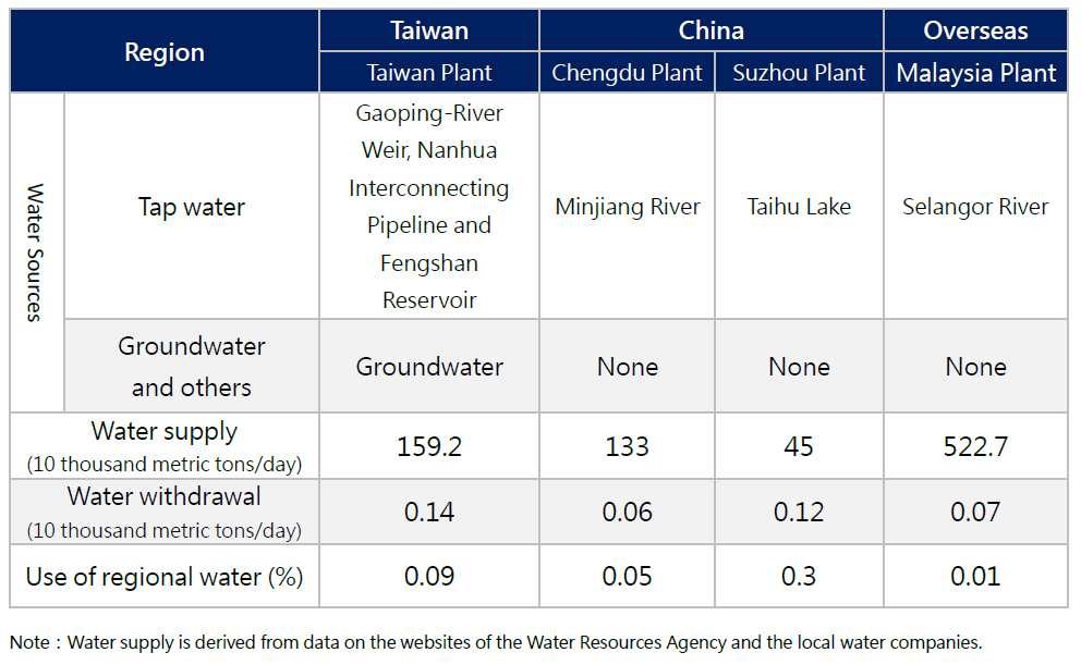 CWE and subsidiary manufacturing plants primarily uses tap water for wet processing (plating), cleaning and environmental protection purposes. The water sources for each plant are from surface water supplied by third parties, with all sources being freshwater (≤1,000 mg/L total dissolved solids). Taipei Branch of CWE receive water from the Xindian Stream (including Feicui Reservoir of Nanshi Stream and Beishi Stream), Taichung Office of CWE receive water from the Shigang Dam and Liyutan Reservoir. The water supply for the Taiwan plants comes from the Taiwan Water Corporation, specifically the Gaoping River Weir, Nanhua Interconnecting Pipeline, and Fengshan Reservoir; the plants in China receive water from the Minjiang River and Taihu Lake, while the overseas plants source water from the Selangor River. None of these raw water sources are classified as national or international nature reserves, nor do they come from sensitive water bodies. Additionally, based on the AQUEDUCT WATER RISK ATLAS, the water risk assessment for each plant indicates that the plants in China are rated as "High-Medium risk (3-4)" due to water stress, while all other locations are classified as "Low-Medium risk (1-2)" and are not considered water-stressed areas.