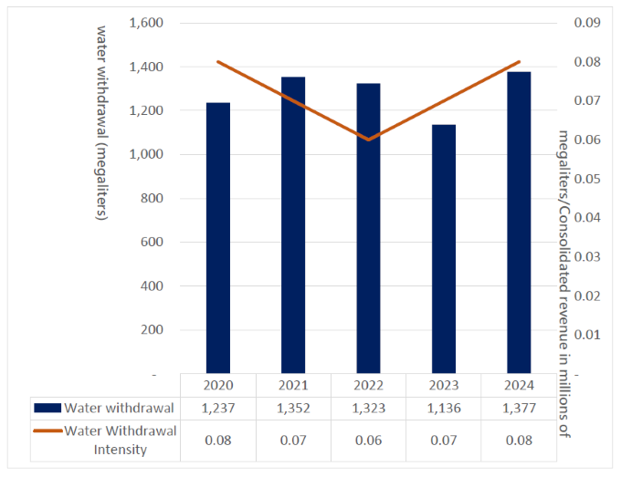 The increase in total water withdrawal in 2024 compared to 2023 was due to higher production output. The total water withdrawal in 2024 amounted to 1,376 million liters; however, the overall water recycling rate also increased compared to 2023.