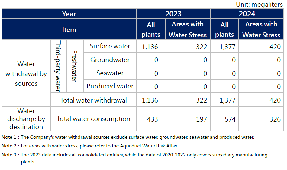 Water consumption by site for 2024 is detailed in the table below. In the face of global climate changes in recent years, we continuously monitor our water consumption and proactively promote plant-wide water-saving measures to ensure there is no immediate water scarcity issue arising from a lack of water resources. Since 2021, our Taiwan plants have begun installing systems for process water recycling. The systems treat and filter rinsing water with high acid concentration for reuse instead of releasing it directly from the wastewater treatment plant as was our previous practice, thereby increasing the reuse rate of process wastewater. There are also other water-saving measures in place to lower our water consumption.