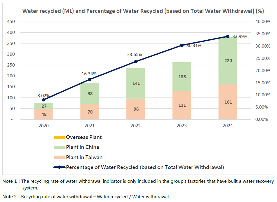 In 2021, the Taiwan plants installed recycling systems where process water is recycled for reuse through ultrafiltration (UF) and reverse osmosis (RO) processes. In 2022, we adopted membrane bioreactors (MBR), Membrance Chemical Reactor(MCR) devices to replace the UF system. The enlarged membrane pore size increased fluxes and improved the fouling issue, enhancing the efficiency of the water recycling system. At the same time, the switch reduced the frequency of backflushing and chemical cleaning and consequently the consumption of recycled water. Additionally, the less frequent replacement of filter bags led to waste reductions.In 2023, the combination of MBR / MCR and RO processes increased the average daily volume of recycled water to the industrial tanks by 170 metric tons, the recycled water increased 90 metric tons compared to 2022. In 2024, the combination of MBR / MCR and RO processes increased the average daily volume of recycled water to the industrial tanks by 181 metric tons, the recycled water increased 11 metric tons compared to 2023.