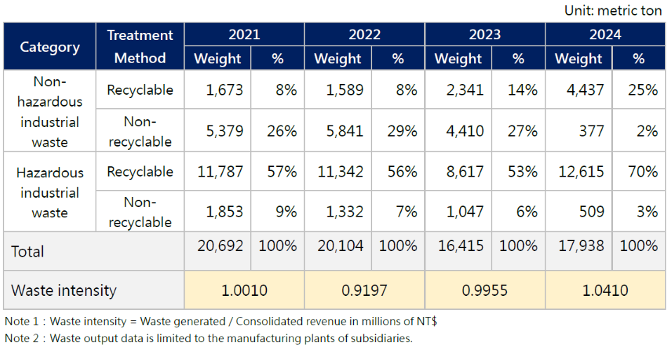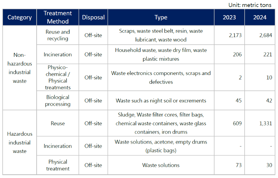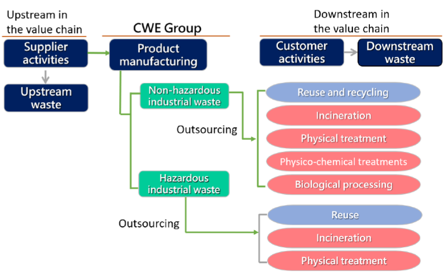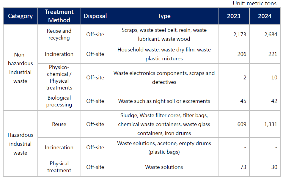 Waste generated by the Company can be categorized into two major types: “non-hazardous industrial waste” and “hazardous industrial waste,” which are further classified into recyclable and non-recyclable waste based on disposal methods. In addition to implementing waste sorting, CWE Group complies with local regulations for waste reporting, sorting, and storage, and engages qualified vendors to assist in the removal, disposal, and recycling of waste. We ensure that our waste is properly handled through regular vendor reviews and audits. For example, subsidiary CWTC's Taiwan Plant No. 2 manages industrial waste online through the "Three-Party Waste Disposal Control and Delivery Form." It also formulates an audit plan for waste clearance and disposal organizations by dispatching personnel to conduct on-site inspections of their management practices, with the audit results recorded in an inspection log. If any irregularities are detected during inspections, the company will notify the contractor to make improvements and schedule a follow-up audit to ensure that the waste is managed in compliance with regulations.