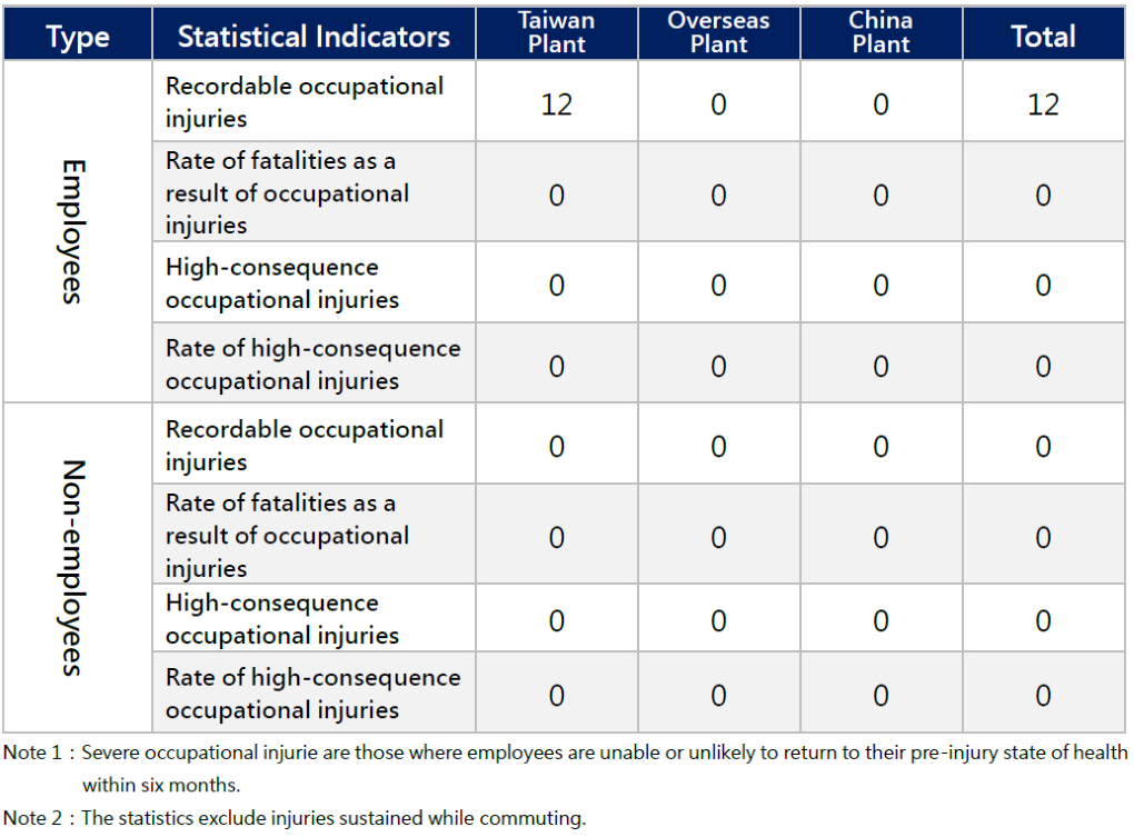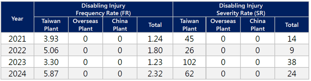 Occupational injury statistics are calculated based on the definitions provided by the “Occupational Safety and Health Act” and the key disabling injury indicators published by the Global Reporting Initiative (GRI), focusing on the frequency rate (FR) and severity rate (SR) of disabling injuries.