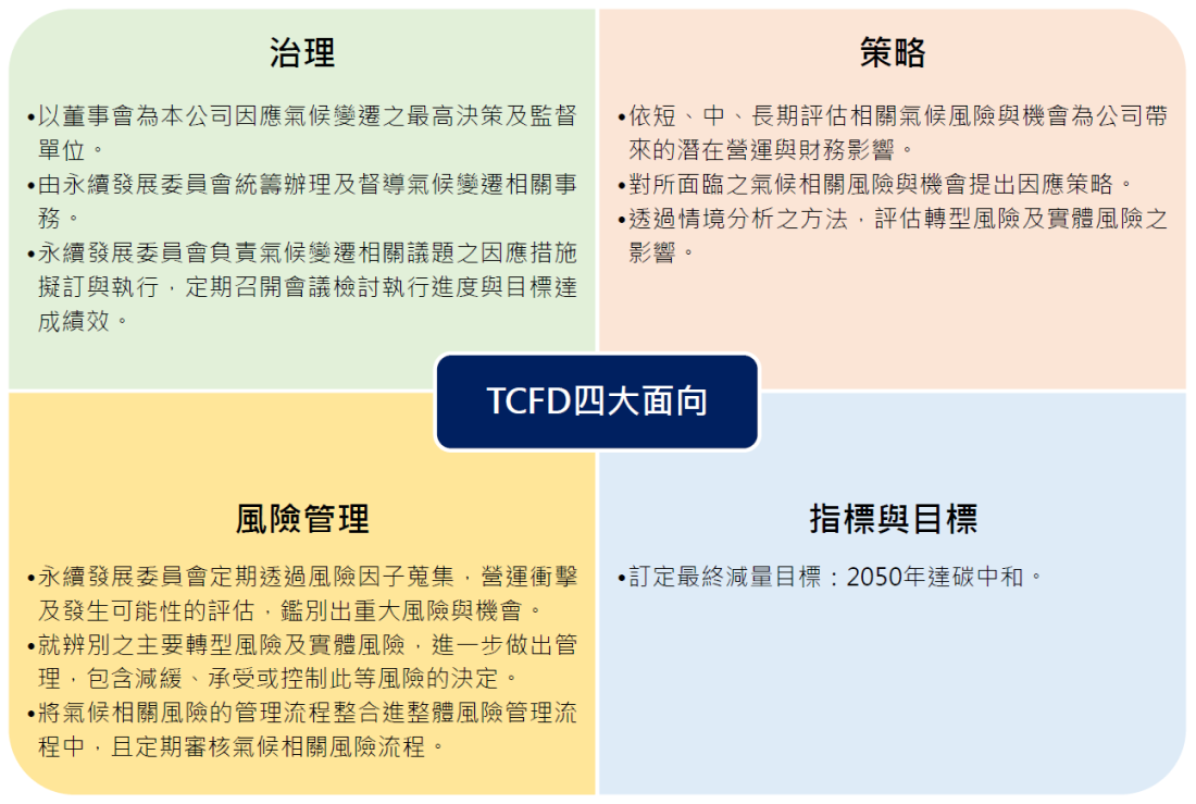 氣候行動已成為國際間檢視減碳承諾的重要關鍵,因此長華電材依循「氣候變遷相關財務架構揭露」(Task Force on Climate-related Financial Disclosures, TCFD)框架,揭露財務影響之有效數據,揭露氣候變遷所帶來的風險和機會,並建立相關的因應對策以及評估潛在的財務影響,完善氣候變遷因應管理架構,以展現企業營運之韌性。