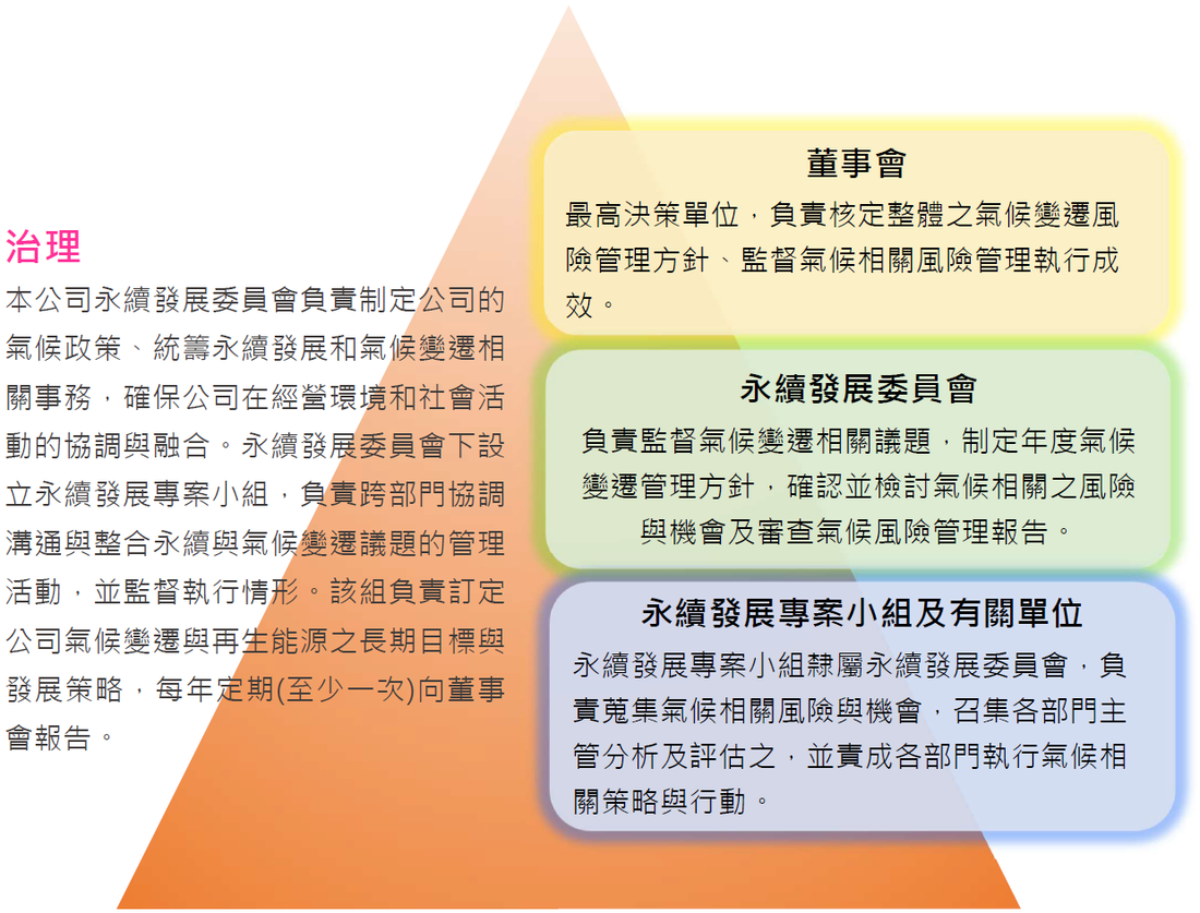 本公司於2023年訂定「風險管理政策」,將氣候相關風險管理流程整合到企業風險管理流程。 其持續工作結果與經驗,權責單位將定期向董事會報告。