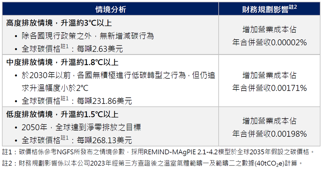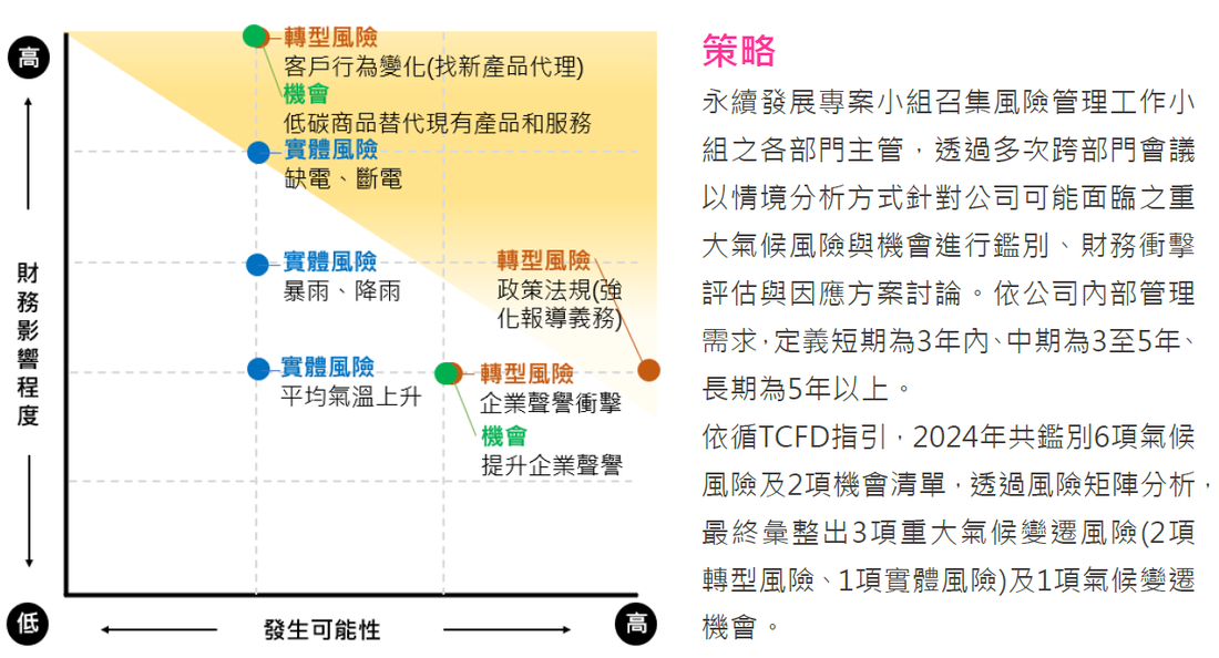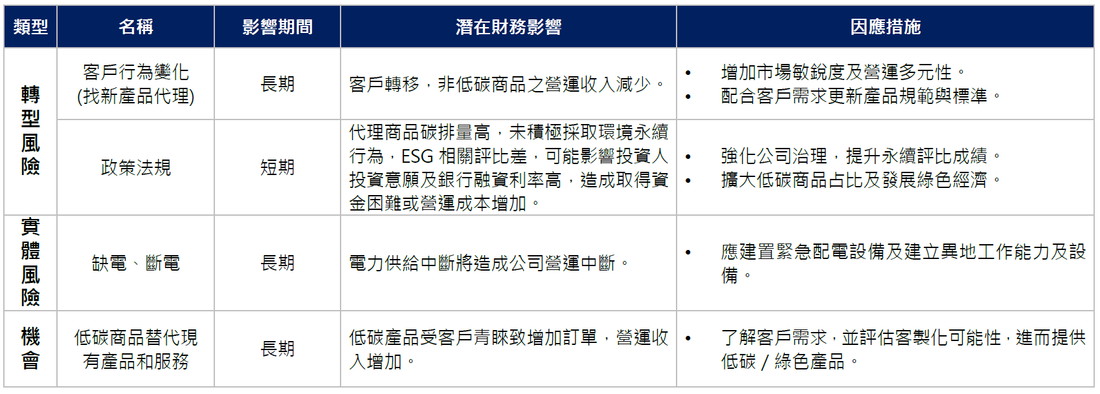 本公司依據TCFD建議運用轉型、實體二種風險類型與氣候機會面臨的最嚴重情境分析評估氣候策略韌性